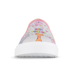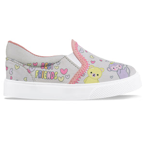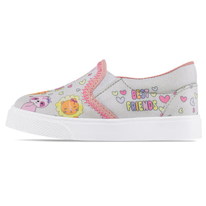 Zapatos casuales para las niñas que quieren sentirse cómodas en un paseo por el parque, el centro comercial o en los días de juego ¡A ellas les van a encantar! Tenis casuales infantiles con diseño tipo slipon y elástico lateral para mayor ajuste. Elaborados en lona sublimada, con hilos brillantes, forro textil y suela en PVC.