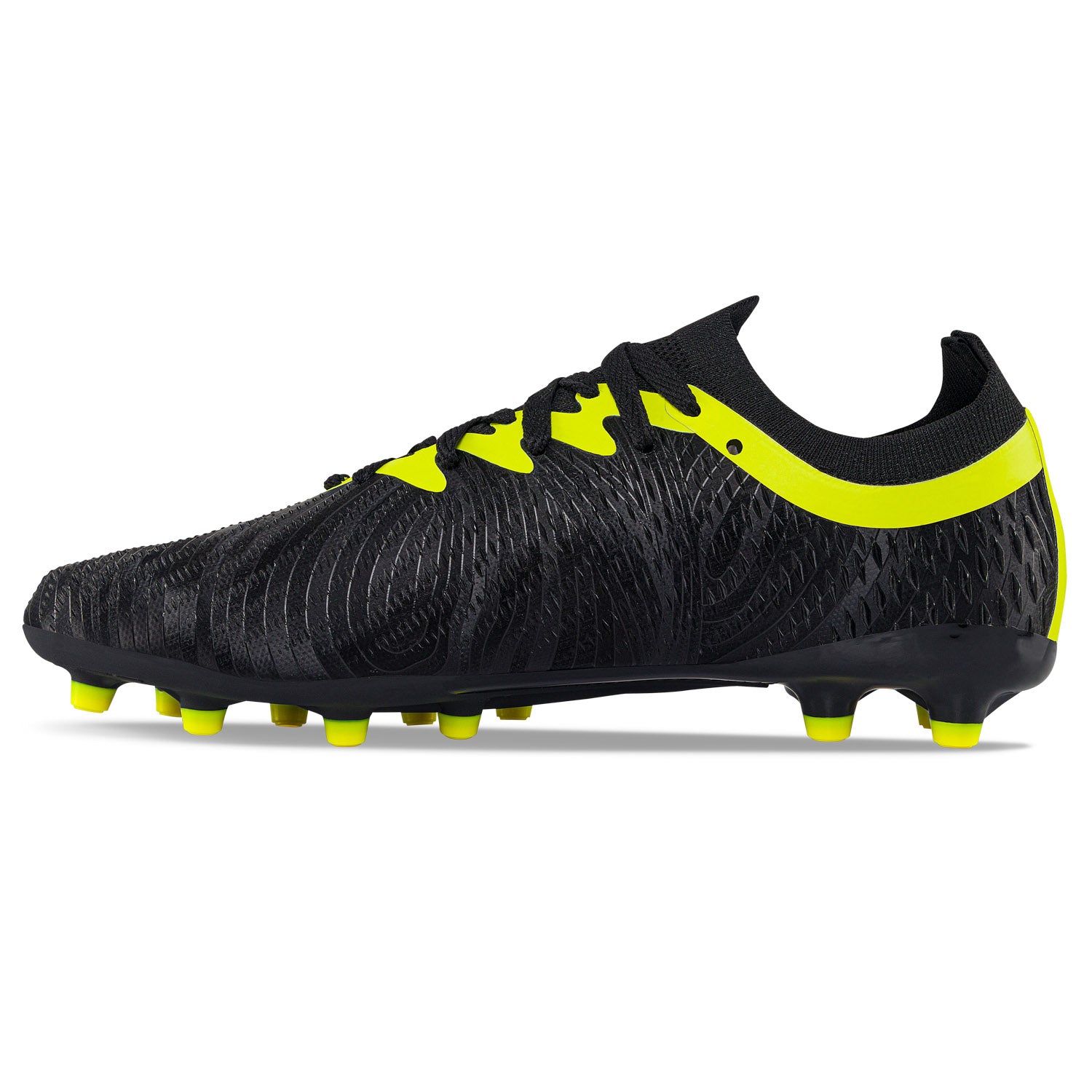 Zapatos para los amantes del fútbol ¡Pon a prueba su resistencia y juega tus mejores partidos con este calzado! Guayos para cancha de grama, elaborados en textil con recubrimiento en TPU para mayor ajuste, efecto metalizado, repujado y textura al tacto, cuello elástico, forro textil acolchado, plantilla ultraliviana de máximo confort, suela en TPU.